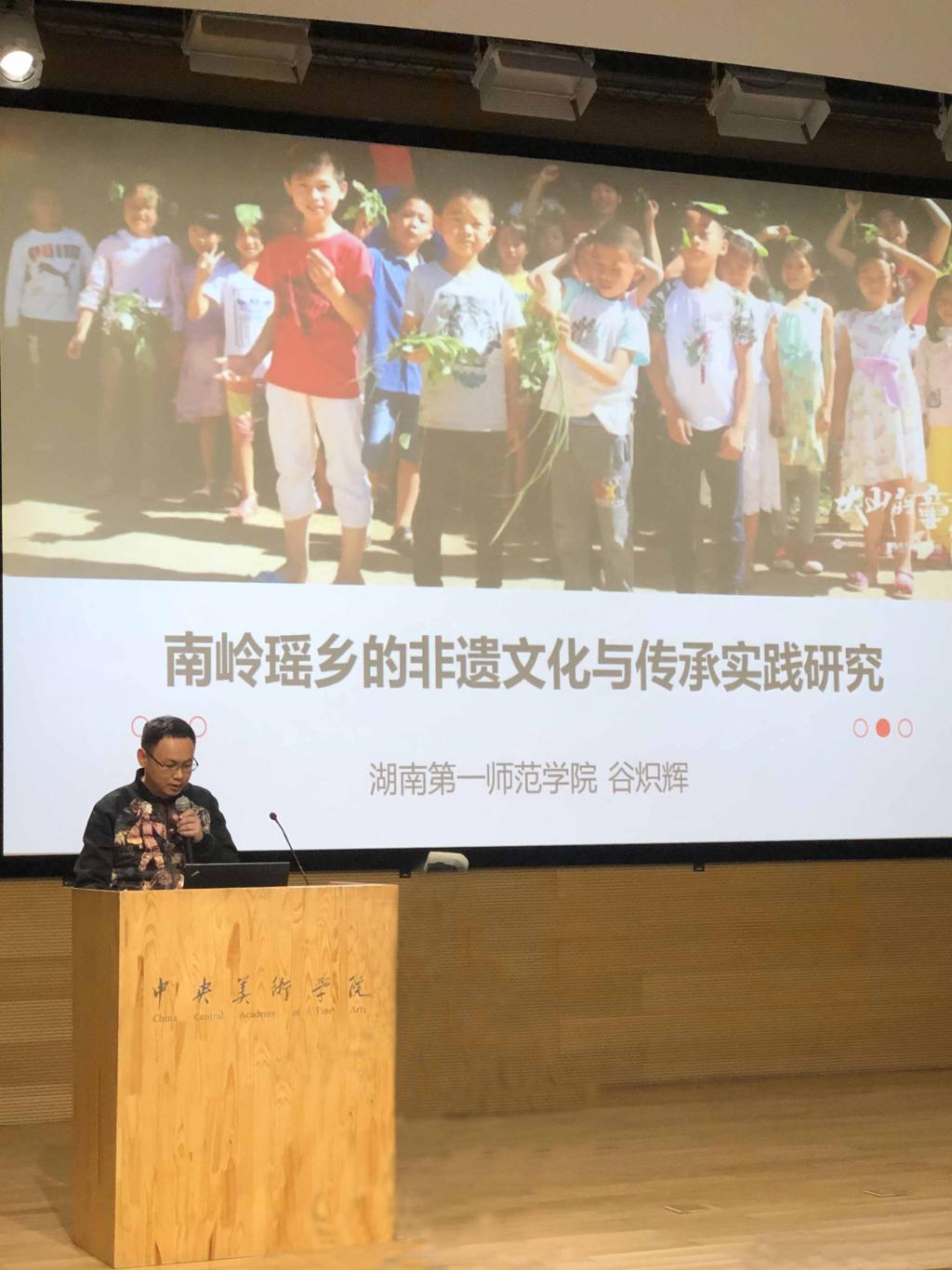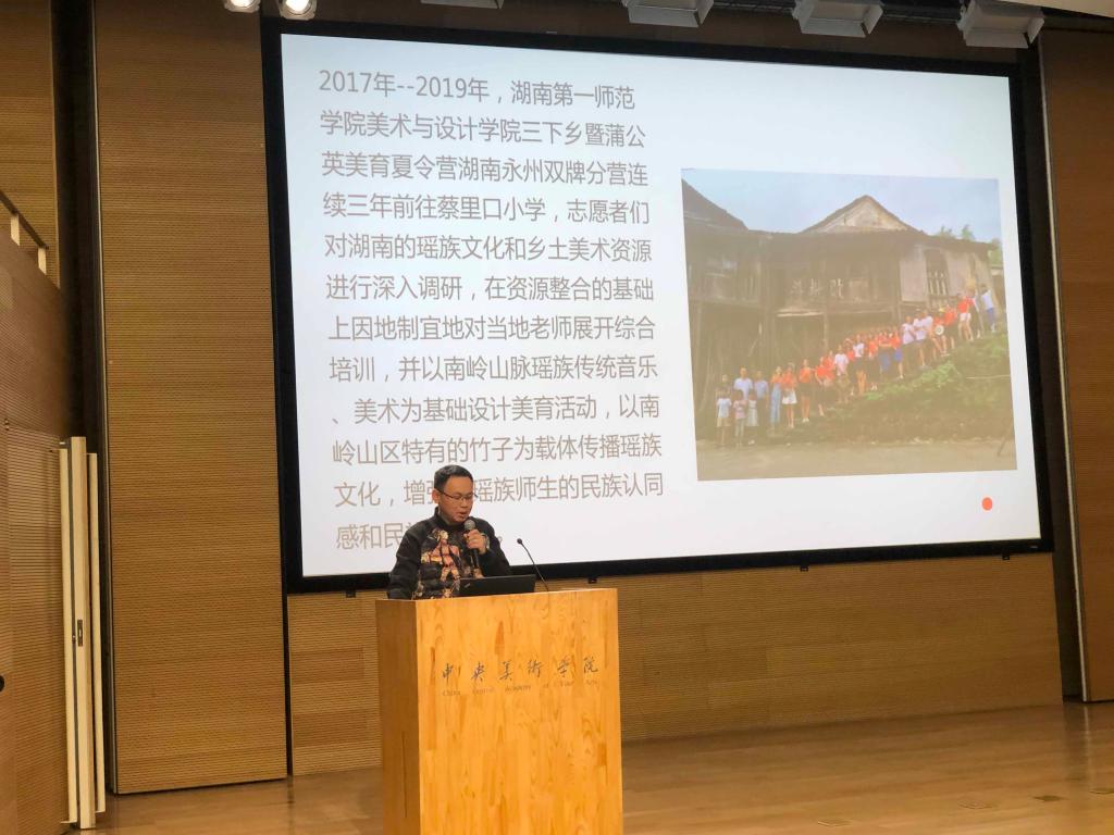谷炽辉老师介绍导师工作坊工作成果并进行“南岭瑶乡的非遗文化与传承实践研究”主题演讲。主题演讲汇报了BV伟德官方网站持续三年在湖南省双牌县蔡里口小学开展的美育夏令营的工作情况,从用教育的方法促进瑶族文化在瑶族农村地区的传承和发展、将瑶族民间文化引入美术课堂和寻找资源为我所用、扩大活动影响力三个方面展开,最后提出因为美育夏令营等各方面的共同努力,一所湖南和广西交界的偏远村小在2019年9月10日获得了国家教育部“全国教育系统先进集体”的荣誉称号,引起了与会者的广泛兴趣,得到了他们的高度赞誉。他们一致认为,美育夏令营很有成效,向孩子们传承了丰富的民间美术知识,促进了教育公平,为基层乡村教师培训了美育能力,提升了校园环境,南岭瑶乡的非遗文化得到了较好的保护和传承。