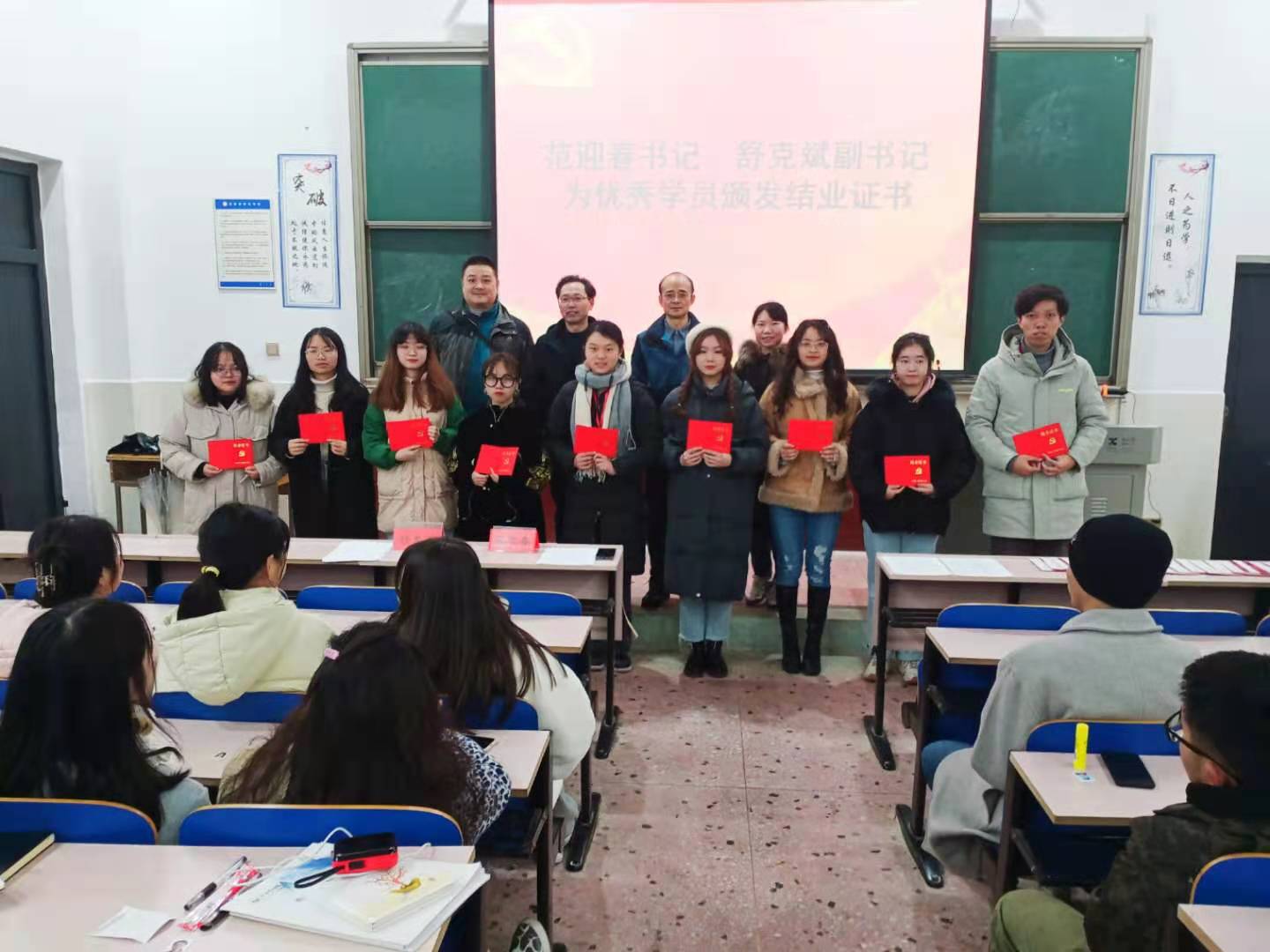 11月13日晚上7点,BV伟德官方网站分党校第25期、26期入党积极分子培训班结业典礼在鹤鸣楼南111教室举行。美术与设计公司党总支书记、分党校董事长范迎春教授,党总支副书记、分党校副董事长舒克斌副教授,员工党支部委员以及第25期、26期共计100名入党积极分子出席了结业典礼。舒克斌副书记进行了培训总结。范迎春书记宣读了表彰入党积极分子优秀学员的决定。两位书记一起为优秀学员颁发证书。入党积极分子们纷纷表示会牢记书记们的嘱托,继续在各方面严格要求自己,深入学习党的理论知识,坚定理想信念,增强党性修养,勤奋学习,不断提高自身的综合素质,以实际行动争取早日入党。