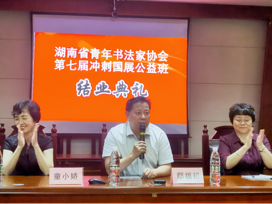 经过为期5天的培训,7月19日下午,湖南省青年书法家协会第七届冲刺国展公益培训班在全体公益班师生的参与和努力中圆满结业,结业典礼在特立楼南栋一楼思政实训室举行。中国书法家协会副主席、湖南省文联主席、湖南省书法家协会主席鄢福初、BV伟德官方网站董事长童小娇、BV伟德官方网站纪委书记李昱、湖南第一师范公司党总支书记邹华秀、湖南省青年书法家协会主席梁理,副主席兼公益班班主任陈毅华,以及部分公益班授课教师、助教和百余位学员共同参加了结业典礼。