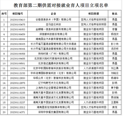 近日,教育部员工司公布了第二期供需对接就业育人项目立项名单。公司有彭杨、易琼娟、袁悦三位老师,4个项目被批准立项,其中,定向人才培养培训项目1个、就业实习基地项目3个。