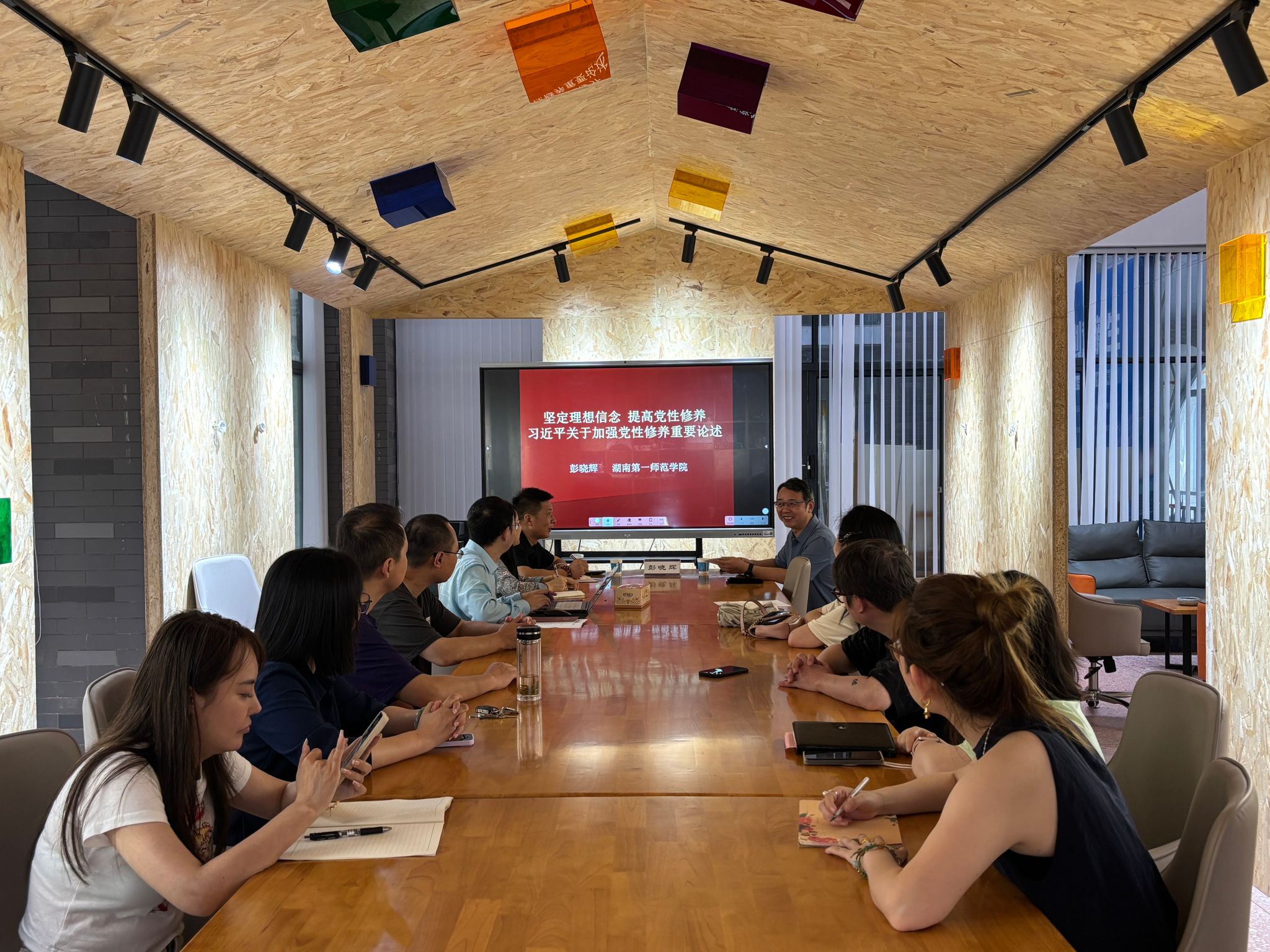 6月24日下午,公司党委委员、副董事长彭晓辉在鹤鸣南会议室为公司设计学党支部上了一堂生动的党课。公司党委书记杨虎智、副书记曾琳娜和设计学党支部全体党员聆听了党课。
