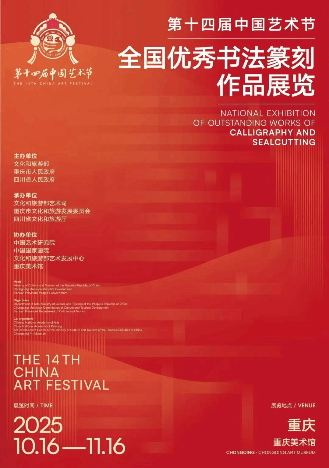 10月16日,由文化和旅游部、重庆市人民政府、四川省人民政府等单位联合举办的第十四届中国艺术节全国优秀美术、书法篆刻、摄影作品展览开幕式在四川美术公司举行。公司书法学系钟全昌、冯高两位教师作品入选本次展览。充分体现了公司教师创作能力与艺术水平。
