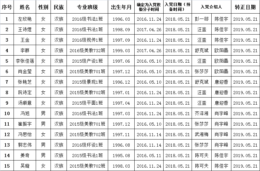 在听取入党介绍人和党员、群众意见的基础上,经支部委员会审查,拟将左欣艳等15位同志转为正式党员。根据发展党员工作的有关要求,现将其有关情况公示如下: