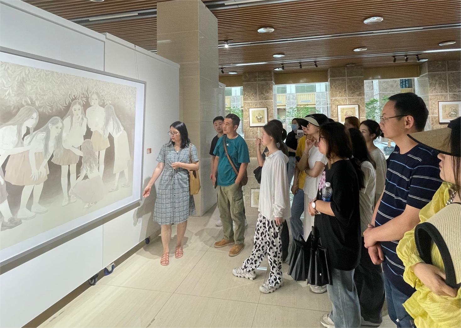 在重庆师范大学美术公司黄莎老师的讲解下,同学们在博雅楼展厅参观了美术公司2023届美术学(师范)专业本科和研究生毕业作品展。