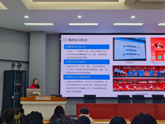 会议由谷炽辉老师主持。21初招美术学班和21级美学班员工代表通过图文、视频等形式汇报了为期一学期的教育实习成果。汇报内容涵盖小学课堂教学、课外艺术活动指导、校本课程开发等多元领域。员工代表结合真实案例,分享了在美术课程设计、班级管理、员工心理辅导等方面的实践心得,并反思了从"学习者"到"教育者"角色转换中的挑战与成长。