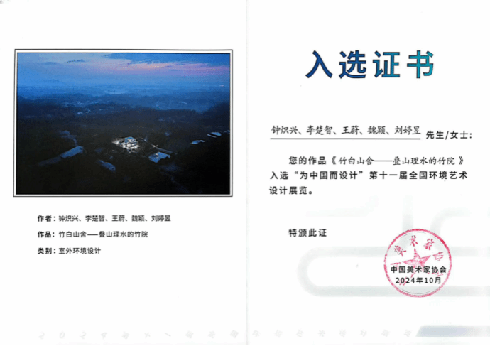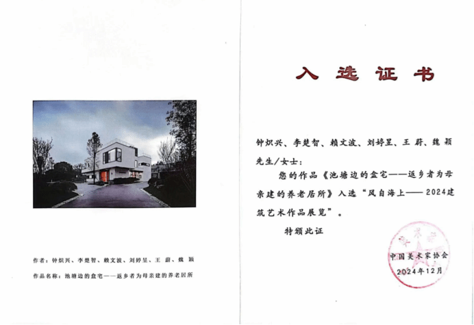 今年下半年两位老师与设计团队在长沙近郊合作设计建设完成的住宅建筑作品《池塘边的盒宅——返乡者为母亲建的养老居所》《竹白山舍——叠山理水的竹院》分别入展“风自海上——2024建筑艺术作品展”“为中国而设计”第十一届全国环境艺术设计展,实现了本院设计类作品入选中国美术家协会主办大展零的突破,可喜可贺!