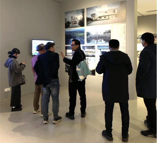 钟炽兴、李楚智两位老师在“风自海上”2024建筑艺术作品展上为中国美术家协会建筑艺术委员会主任、中央美术公司副经理吕品晶教授(左二)和天津大学建筑公司孔宇航教授(左一)介绍参展作品