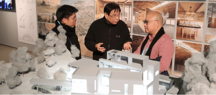 钟炽兴、李楚智两位老师在“风自海上”2024建筑艺术作品展上与中国美术家协会建筑艺术委员会秘书长、中央美术公司建筑公司程启明教授(中)交流参展作品